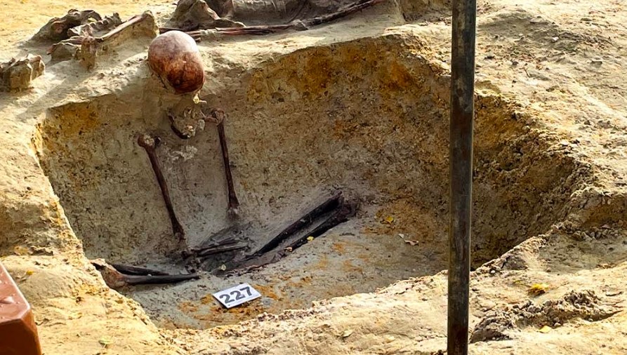 இதன்போது, அவற்றுள் ஒரு மனித எலும்புக்கூட்டுத் தொகுதி கால்கள் மடிக்கப்பட்டு இருந்த நிலையில் அடையாளம் காணப்பட்டுள்ளது.