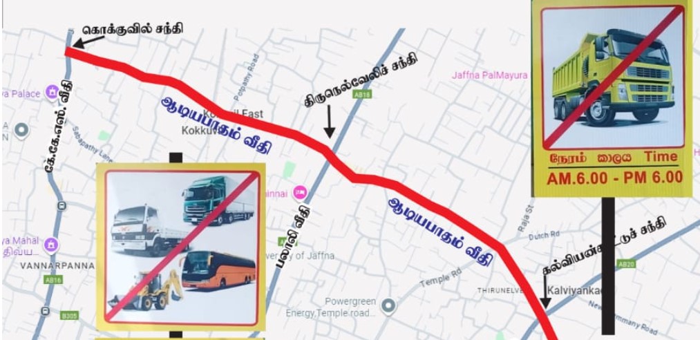 யாழ். புதிய செம்மணி வீதிச் சந்தியில் இருந்து கொக்குவில் சந்தி வரையான ஆடியபாதம் வீதியூடாக டிப்பர் வாகனங்கள் காலை 6 மணி தொடக்கம் மாலை 6 மணி வரை பயணிப்பதற்கு முற்றாகத் தடை விதிக்க நடவடிக்கை எடுக்கப்பட்டுள்ளது.